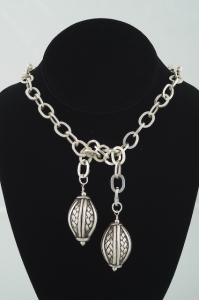 "Okay, they’re not real footballs. This is a fabulous smooth oval link chain of 28 inches, end to end, finished with silver basketweave footballs. Certain to start many conversations."