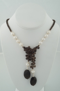 "This versatile Harmony, measuring 24 inches, end to end, looks great dressed up or down. The run of beautiful quality 8 mm white freshwater pearls set between sterling silver have a slim look at the top, and fills out a bit below with the flow of faceted briolettes coupled to a lovely pearl and faceted oval smokey drop."