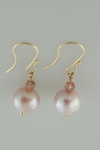 Large and lustrous freshwater pink pearls with beautifully faceted pink tourmaline accents on a 14k gold earwire. Lovely.