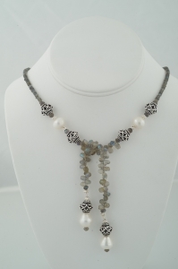 "Measuring 24 inches end to end, this Labradorite Harmony offers texture and feels a little reminiscent of faraway places. Beautiful, iridescent rondelles fold into large, sculptured sterling silver beads, framing a solo white freshwater pearl set between small sterling silver bali beads. The bottom beads evoke the middle treatment, and dangle from beautifully faceted briolettes. A real stand out."