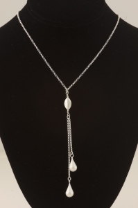 I love this necklace. It does look rather simple on the bust, but wearing it makes a surprising (even to me!) impression of modern, casual elegance. The teardrops are brushed sterling silver, as is the bolo piece. Light as a feather, measuring 16 inches, with a lobster clasp. Dresses up or down.