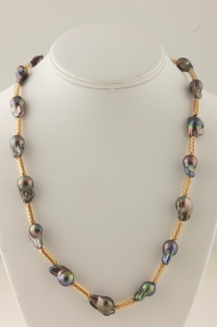 As I was saying in the description of the necklace in white baroque pearl, I finally sprang for these fabulous pearls. The ones in black are even more irregular and weird than the white ones - making for an incredibly beguiling look. The luster on the black ones is amazing. This necklace will definitely have an impact wherever you go. I saw a similar strand of white ones in the Gumps catalog with no gold selling for about $6000.