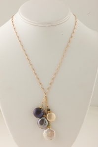 This is a very cool necklace on a lovely 14k gold scalloped chain. Coin pearls in different colors, pictured here in white, black, grey and peach with solid gold and faceted tourmaline in a variety of colors. No two alike. But each one will be quite beautiful. If you have a color preference, let me know. The chain is about 25 1/2 inches long and closes with a 14k gold lobster clasp. Call or email me for pricing on a length of your choosing.This is a fabulous piece. Versatile, subtly high end. (This does not look like gold fill) Layer with others or by itself. It will stand up.