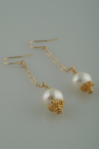 A long dangle of 14k gold holding beautiful freshwater white pearls capped by a flower cap of solid 14k gold.