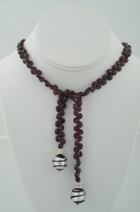 Luscious faceted garnet briolettes in a 24 inch length, end to end, complemented at the bottom with silver foil and burgundy swirl Murano balls, set between sterling silver beads.