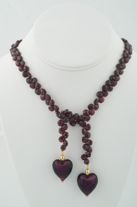 Deep burgundy faceted garnet briolettes in a 24 inch length, end to end, completed with beautiful burgundy Murano hearts hanging from 14k and 18k gold beads.