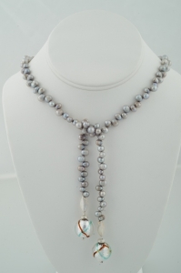 A lovely strand of grey freshwater pearls in a 24 inch length, end to end. The intriguing Murano balls are silverfoil with stripes of turquoise and a coppery brown. They hang from bright sterling silver beads.