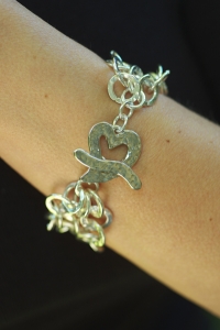 An artful, luxurious triple strand of hand made, 99% pure fine silver from the Karen tribe in northern Thailand. The round links are hand hammered and lustrous in appearance. The modern heart clasp is hammered sterling silver. All together, this bracelet grabs attention wherever you are. Wear it often and enjoy.
