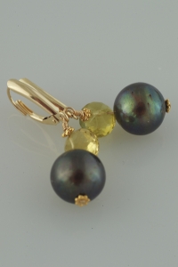 A modern design with the onion! Shape, that is. A beautiful quality onion-shaped lemon quartz briolette sits atop a very large and beautiful freshwater black pearl. All in 14k gold. Very cool.