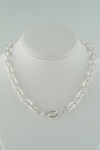 A Drape of smooth oval links that look fresh and lively. A terrific accent for most occasions. The silver is handmade Hilltribe silver from northern Thailand that is about 98% pure fine silver. It has a notable heft and a beautiful gloss. It definitely looks different from other silver. Measures 17 inches and closes with a large sterling lobster clasp.