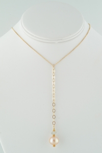 A classy combination of two 14k gold chains, one beautiful high luster freshwater peach pearl topped by an exquisite green amethyst rondelle framed by solid 14k gold. Very lovely. Can be paired with the Double Drape Necklace with Peach Pearl and Green Amethyst for a dazzling look. Measuring about 16 inches and closing with a 14k gold lobster clasp.Also available in peach pearl and faceted andulusite rondelle. Specify which one at checkout.Call or email for pricing on a chain length of your choosing.