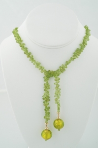 Exceptionally beautiful faceted petite peridot briolettes in a 24 inch length, end to end, finished with Murano balls highlighted by a gold foil glowing interior, dangling from 14k gold beads.