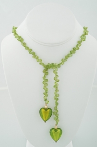 Sparkling faceted peridot briolettes in a 25 inch length, end to end, complemented at the bottom with glowing Murano hearts with a gold foil interior, dangling from 14k gold beads.