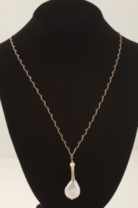 Who can argue with a long (24 inch) 14k gold scallop chain and a fabulous large high gloss freshwater white coin pearl dangling very nonchalantly? Effortless style. Closes with a 14k gold lobster clasp.
