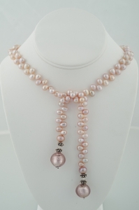 A beautiful, lustrous strand of pink freshwater pearls in a 24 inch length, end to end. The Murano balls at the bottom are pink with a silver foil interior, and dangle from a pink pearl and elegant sterling silver bali style beads.