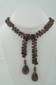 "This has been a favorite of mine since I first designed it. It looks great on everyone and works well with jeans, suits and dresses. (Really!) It comes in two slightly different looks. This one is beautifully faceted smokey quartz briolettes in a 24 inch length, end to end. The bottom is finished in flat smokey quartz drops for a bit more tailored look."