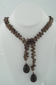 "A beautiful shade of taupe-y brown faceted smokey quartz briolettes in a 24 inch length, end to end. The bottom is finished with round, faceted, teardrop-shaped smokey quartz drops. "