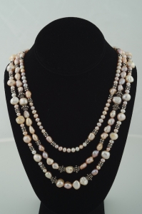 Lush three stand necklace of many sizes and shapes of freshwater pink pearls with sterling silver bali style beads as accents. This necklace has a longer drape, with the shortest of the three strands measuring 17 inches across; the longest, about 21 inches. The beautiful sterling silver clasp measures an additional two inches. An elegant piece.