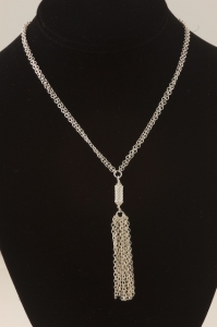 I love this fringe. It's so fun. Feels great to wear and looks great, too. Dresses up or down. Double chain of sterling silver, 16 inches, lobster clasp. Enjoy.