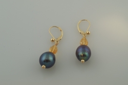 "Gorgeous large freshwater black pearl with faceted citrine briolette, 14k and 18k gold accents, on a hinged 14k gold ear wire."