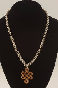 Hand carved Celtic Knot from Indonesian bone. Chain of hand made Thai silver. Measures 17 inches across and closes with a very large sterling silver lobster clasp. I love this chain. It feels great on your body and looks very cool.