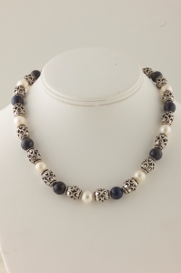 Ethnic-looking lapis and white pearl necklace with sculptured sterling silver. Looks great with suits or casual dressing. Wear day and night for different looks. I liked this one so much, I made something similar for myself. It really pops. Measures 16 1/2 inches across and closes with an attractive sterling silver flower toggle clasp. Very wearable.
