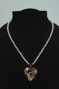 Bold, yet demure necklace of lovely faceted moonstone rondelles holding a Murano heart in black, silver, and a bit of pink. It looks like a mini piece of modern art! With little onyx and sterling silver accents, and closing with a twisted sterling silver toggle, this 17 1/2 inch necklace is a conversation piece.