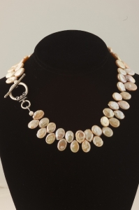 Very pretty pink pearl confection that fits beautifully around the neck. The high quality pink pearls are variegated in color and are flat and oval in shape. Measuring 17 inches across and closing with the large sterling silver toggle clasp pictured, this necklace is a perfect accent to a dress or casual evening out. Beautiful with white and black, and will stand up very well with prints.