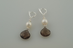 "Lovely faceted smokey quartz teardrops with white freshwater pearls, set between sterling silver beads, hanging from an elegant sterling silver hinged ear wire."