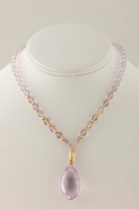 A beautiful shade of amethyst - pale lavendar - like lilacs, one of my most favorite flowers. This is a lovely statement piece in faceted amethyst balls, 14k gold and a very large, faceted teardrop of beautifully translucent amethyst. Measures 15 1/2 inches across for a close choker fit, and closes with a 14k gold toggle clasp. A very wearable treasure to enjoy.