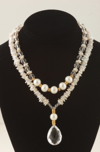 A major statement piece of texture and beauty. Very high quality white freshwater pearls, faceted crystal and lots of 14k solid gold combine in two necklaces for an unforgettable look of lightness and coolness. Can be worn separately or together for three different looks. The crystal pendant necklace measures nearly 19 inches across and closes with a 14k gold toggle clasp. The choker measures 16 inches across and closes with a 14k gold lobster clasp. Versatile and splendid.