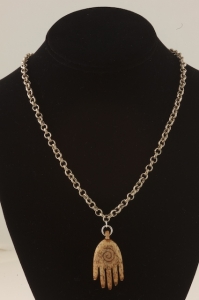 A simple healing hand - hand carved from Indonesian bone. Chain that is hand-stamped and hand made silver from Thailand. Measures 17 inches across and closes with a very large sterling silver lobster clasp. A personal statement.