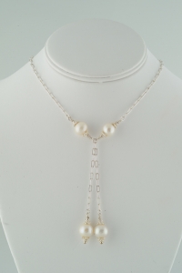Four beautiful freshwater white pearls and thin sterling chain come together for a very classy look that is both sophisticated and modern. The necklace is 16 inches so it hits as a choker. The pearl drop is about 3 inches, and lays nicely on the upper chest. This is a perfect necklace for almost anything. It's lightweight and easy to wear. Lobster clasp. It also comes in pink, black and peach pearl - each having a slightly different look.