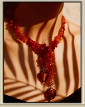 Variegated faceted carnelian briolettes in a 24 inch length, end to end. The Murano heart is deep orange with a silver foil interior. The sterling silver bali style beads provide a balanced offset to the briolettes. Looks beautiful on pale or creamy complexions.