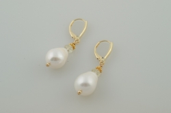 "Large white freshwater pearls with a large pranite rondelle, topped with 14k solid Bali style gold beads, on a 14k gold hinged ear wire."