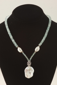 Fresh and lovely aquamarine and white pearl necklace. Gorgeous, high quality faceted aquamarine rondelles with sterling silver accents. The smaller pearls are baroque and the really big pearl drop is an irregular coin pearl that is really fantastic and unique. The necklace measures about 17 inches across and closes with a large twisted sterling S clasp. Versatile, cool and comfortable to wear.