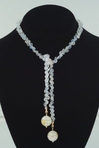 Gorgeous piece with beautiful moonstone briolettes in a Classic Wrapp design, finished with 14k gold and Murano balls of milky white and gold.  Slender look and highly versatile.