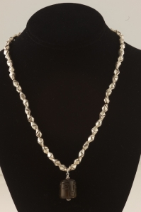 Old carved Asian stone with the reminiscence of a Buddhist temple. The chain is composed of individual, hand made silver beads from Thailand that remind me of an origami package. Exceptionally cool. Only 5 like this one. Measures 17 inches across and closes with a very large sterling silver lobster clasp.