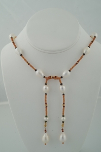 "This slender Pearl Wrapp of hessonite garnet, green tourmaline and deep red garnet, separated by 14k and 18k solid gold Bali style beads, and large white freshwater pearls is at once demure and bold. The colors are quiet but the design asks to noticed. It is an elegant showpiece. Measures 26 inches."