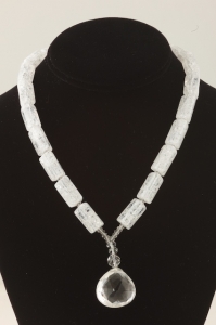 I couldn't resist these cracked crystal triangular-shaped bars. They remind me of frying marbles on the stove to get them to crack. These are just fantastic - in this necklace, the look is ultra modern, eye-catching and fun. The large, high quality, faceted crystal drop is over 40 carats and the large, sterling silver toggle clasp is scuptural. The necklace measures nearly 18 inches across. It's definitely out to a party for this one.