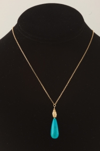 I'm just crazy about this color of turquoise. To me, it is the perfect pure color. This teardrop is simple, but quite beautiful in its simplicity. On a slender 14k gold chain, with a 14k gold lobster clasp. Measures 16 inches. You can easily layer another necklace with this one.