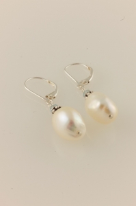 High luster white baroque pearls, with a faceted aquamarine rondelle and a touch of sterling silver. Modern and chic. Wear with the Aquamarine and White Pearl Necklace, pictured.
