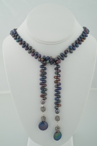 "Small black freshwater pearls in a 24 inch length, end to end. Finished with large black coin pearls, dangling from sterling silver bali balls."