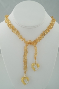 Gorgeous faceted citrine briolettes in a 24 inch length, end to end, finished with gold and silver foil Murano hearts, dangling from 14k gold beads and 18k daisy shaped bali beads.