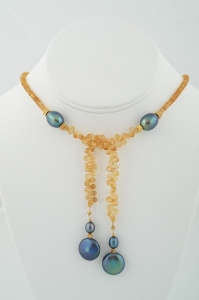 "A demure showstopper. Measuring 24 inches end to end, this Harmony exudes style. The best quality micro-faceted citrine briolettes and gorgeous large 11 – 12 mm black freshwater pearls combine with 14k solid gold bali beads to make this piece memorable. The large coin pearls at the bottom add a touch of finished elegance."