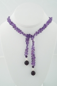 "Extremely beautiful, high quality faceted amethyst briolettes in a 24 inch length, end to end. The bottom is finished with deeply colored amethyst balls set between a jazzy sterling silver ball."