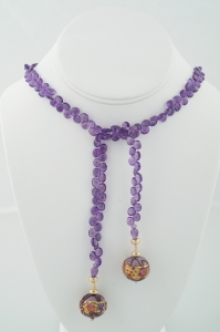 Simply lovely. Beautiful faceted amethyst briolettes in a 24 inch length, end to end, coupled to Murano beads of gold, amethyst dappled with blue, pink and purple. Accented with 14k gold beads.