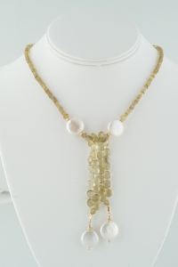 This is a lovely combination of olive colored bear quartz briolettes and large, high luster freshwater white coin pearls, accented with 14k gold. This Harmony Wrapp is highly versatile and will look great with casual and dressier outfits.