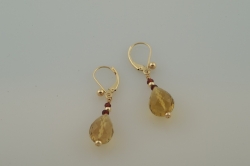 Beautiful faceted bear quartz teardrops dangling with accents of 14k gold and garnets. Hanging from a 14k gold hinged ear wire.