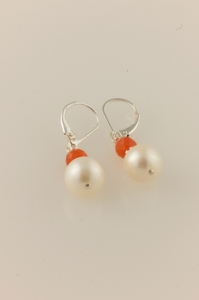 May I say, dainty, white pearl and faceted carnelian briolette earrings that dangle. Accents of sterling silver. Very adorable.